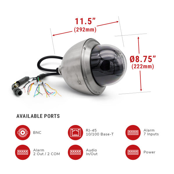 Beyond the P2030X's video skills, this steel-cased video tool integrates into loudhailer and intercom systems with audio I/O on the PTZ's network connector pigtail, coaxial with 7 Alarm In + 2 Alarm out contacts for easy access & connection waterproofing. The camera has an internal heater and is rated for operation -40°F ~ 158°F / -40°C ~ 70°C. Power options include the unit's standard 24VAC/3Amp power brick with a super-wide ±25% input voltage tolerance or PoE+ (802.3at). The camera is, of course, ONVIF, PSIA, & CGI interoperable and FCC / CE approved. Network video streams are optimized with auto-fallback H.265+ / H.265 / H.264+ / H.264 video management & lossless compression. There's even an internal Micro SD card slot for up to 128GB of on-camera video. And with an outer casing made of 316L stainless steel, P2030X is IK10 impact and IP68 water intrusion resistant, so it's safe by the pool or out on the water.