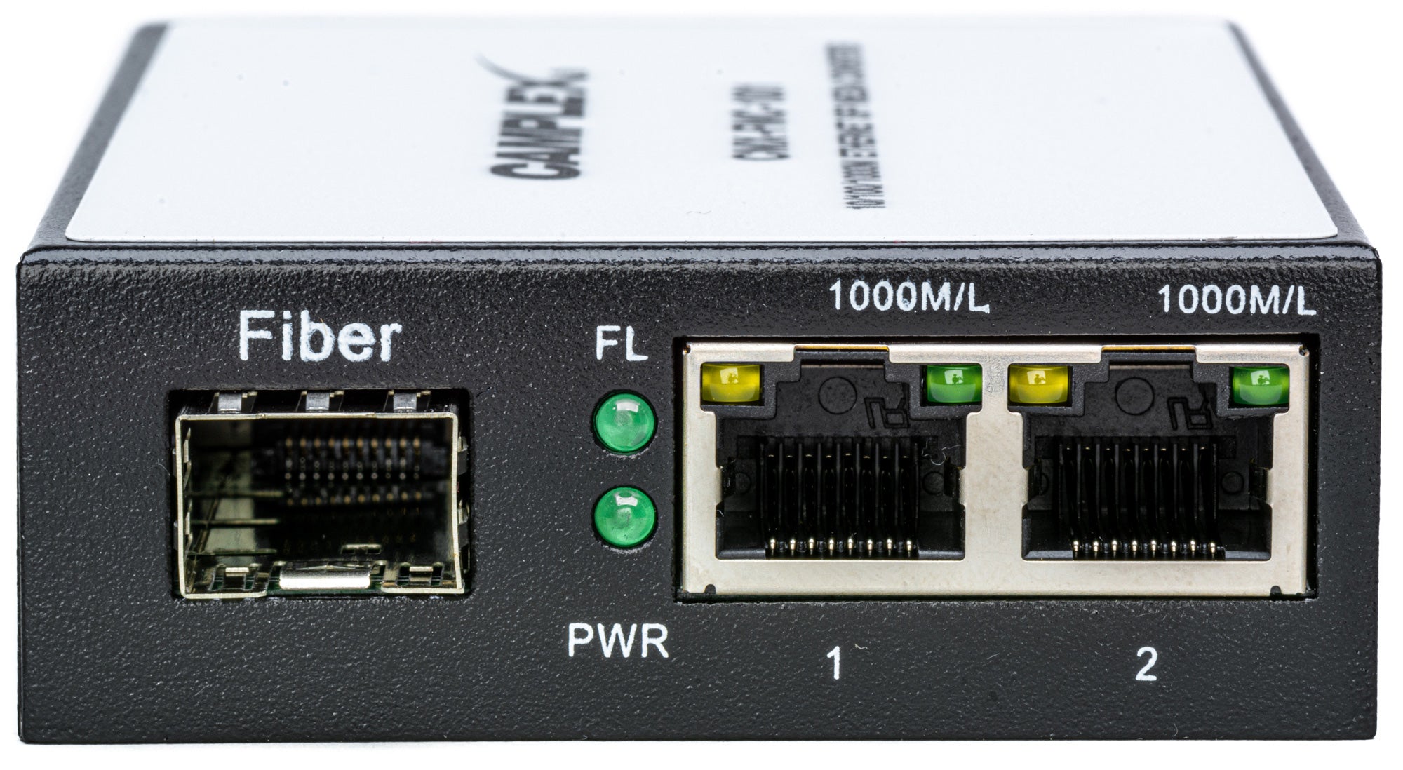 The Camplex FMC-1001 converters 1000Base-T to 1000Base-SX/LX. It houses a single SFP slot and two RJ45 Ethernet ports in a vented, black powder-coated steel cabinet with two LED indicators for power (PWR) and fiber connection (FL). I can be a used as a standalone converter, rackmounted, or chassis-based. Compliant with IEEE802.3z & 802.3ab, CE, FCC, and RoHS standards.